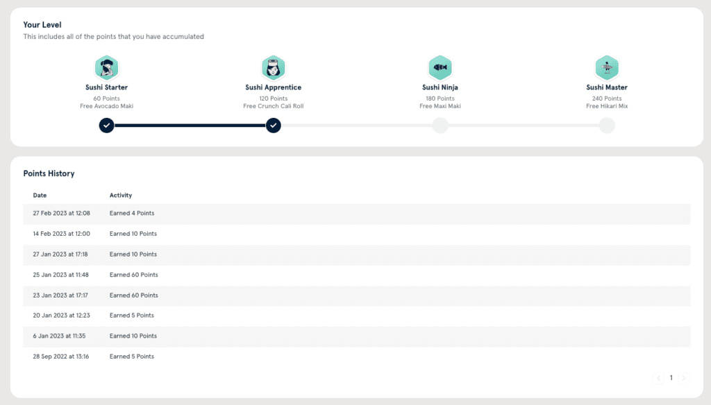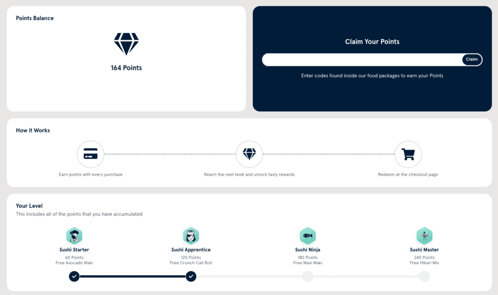 With Sushi Daily Rewards, this customer journey starts at Sushi Starter, through to Sushi Apprentice and Sushi Ninja and ending at the top level of points: Sushi Master. The whole journey is illustrated with Sushi Daily’s beautiful branding and imagery.