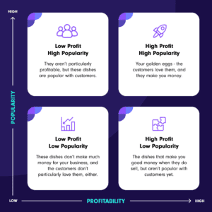 Each dish – including sides and extras – should be labelled Low Profit or High Profit, as well as Low Popularity or High Popularity. You’ll then be able to categorise each into one of the four groups below.