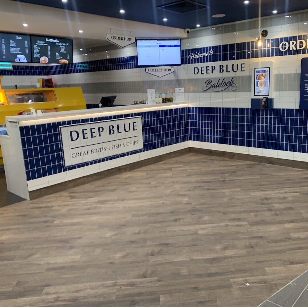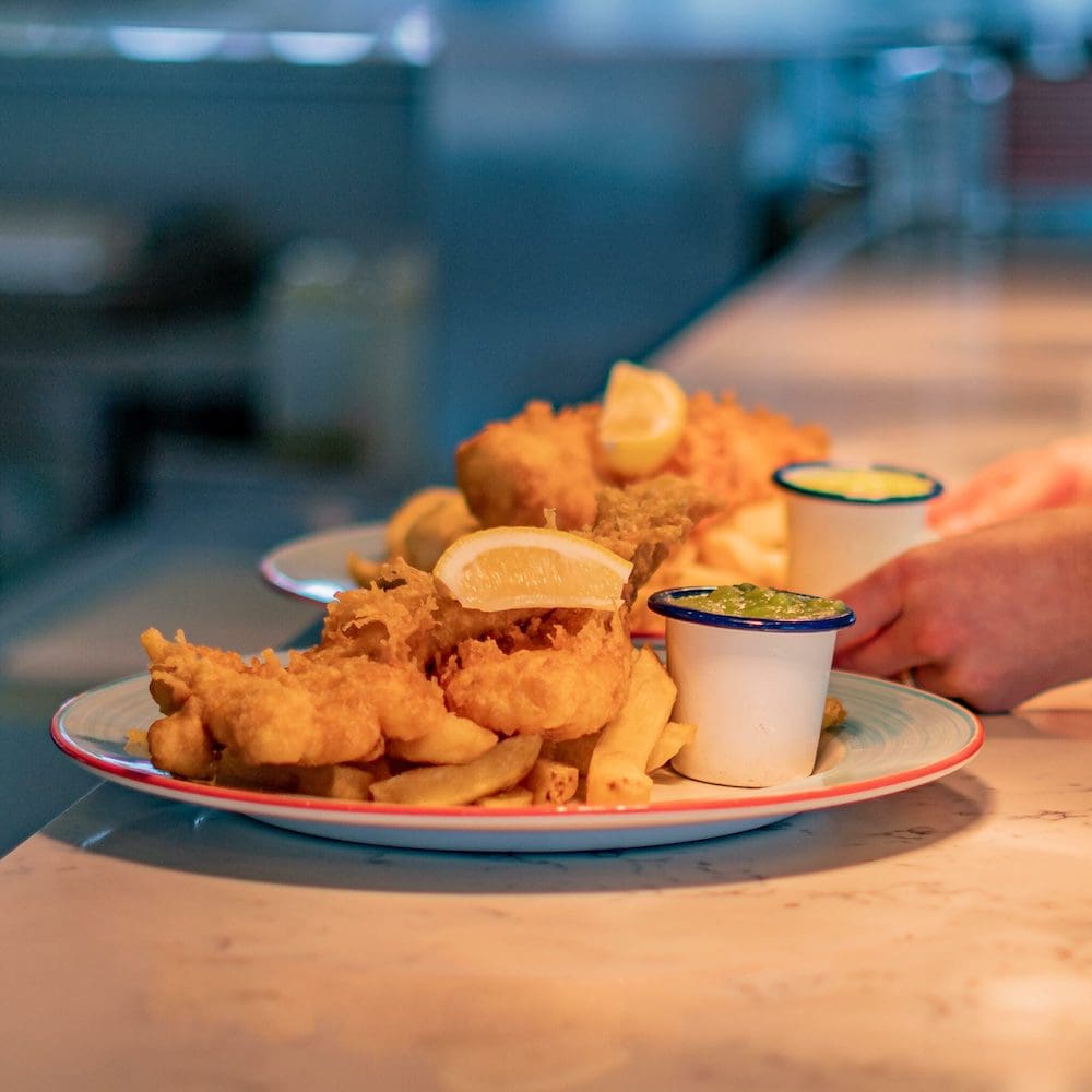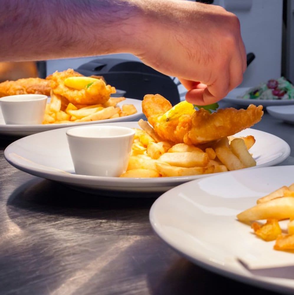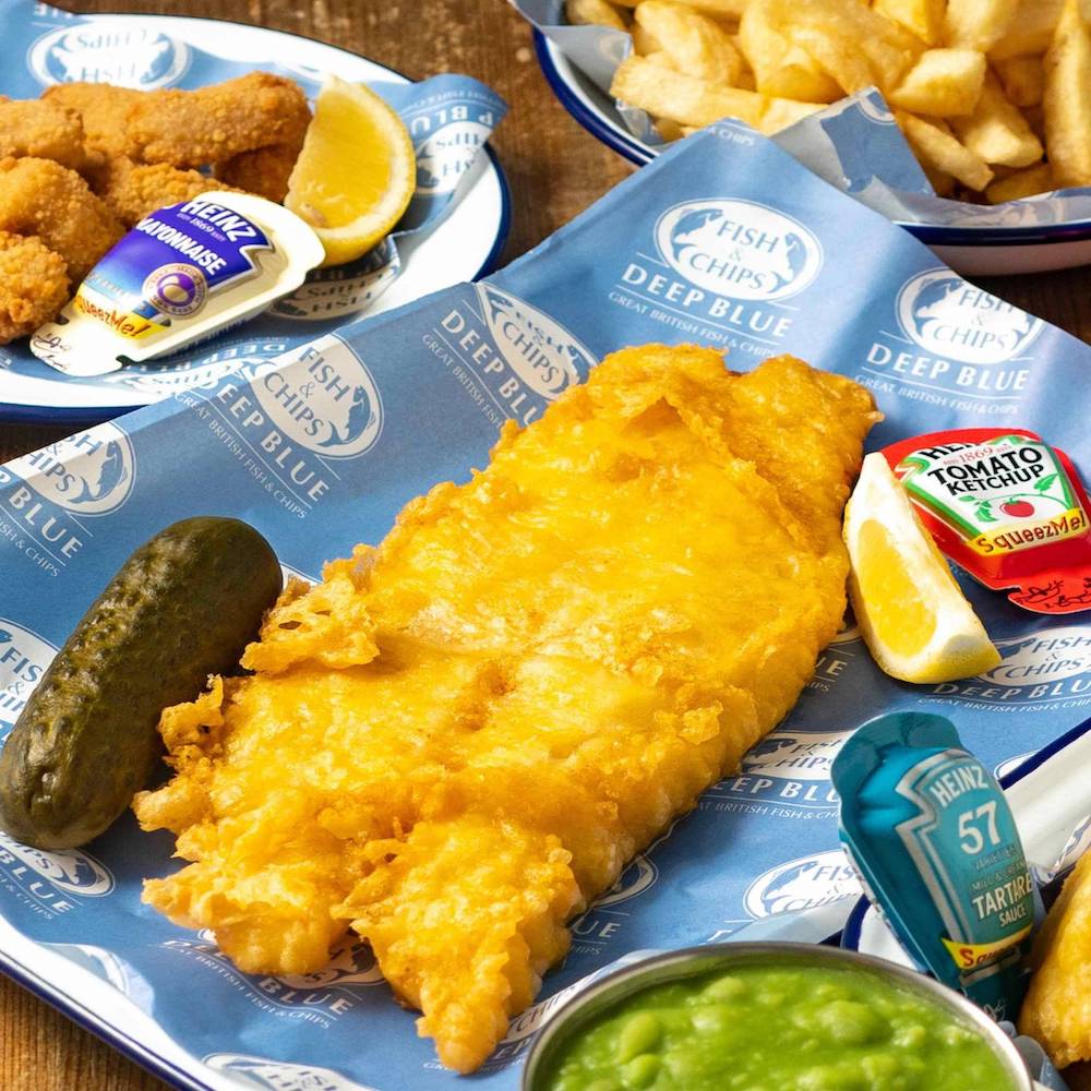 Fish and chips being plated in a Deep Blue restaurant Deep Blue restaurant fish and chip counter Fish and chips from a Deep Blue restaurant Harry Ramsden self-service kiosks Fish and chips being plated in a Deep Blue restaurant
