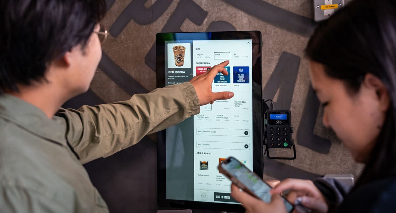 Self-service kiosks let customers browse menus, customise orders, and pay at a digital terminal.